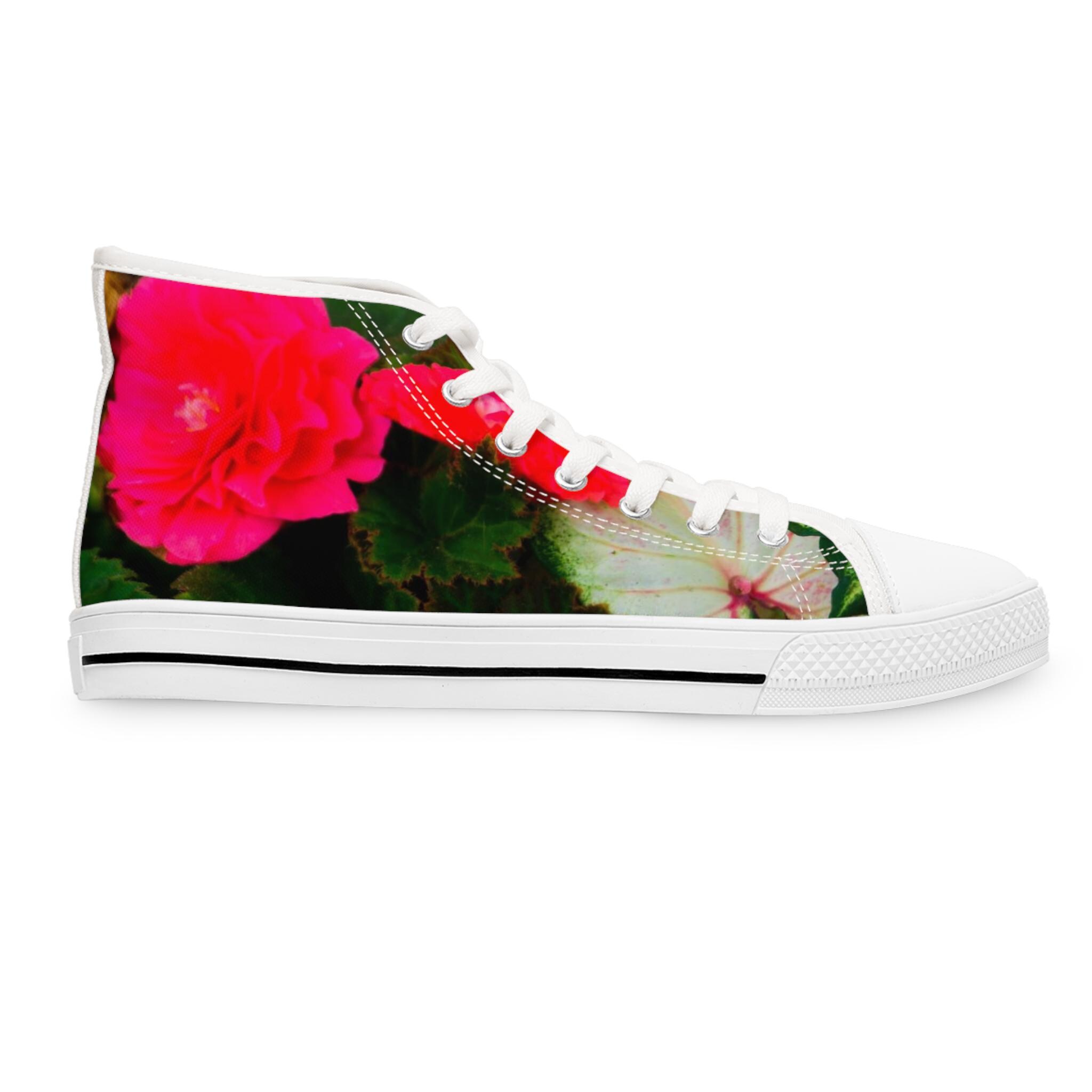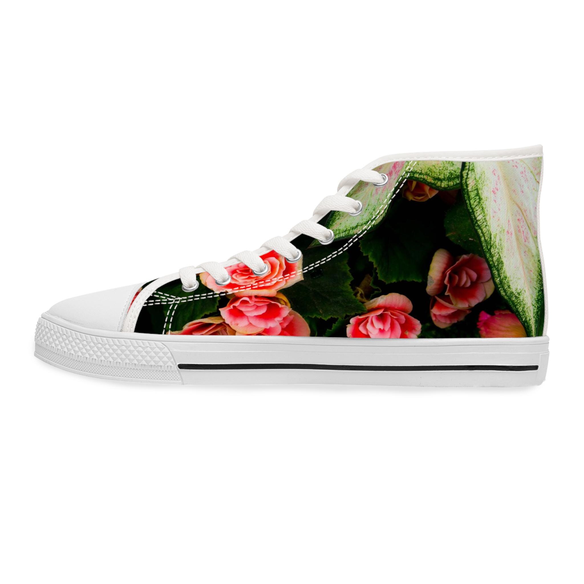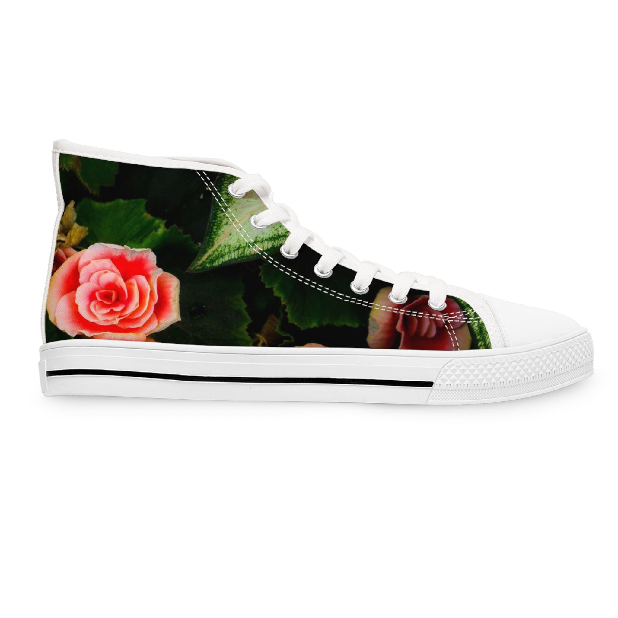 Floral Tapestry Women's High Top Sneakers featuring a beautiful rose design. These sneakers provide a comfortable and stylish option for casual outfits. Perfect for women who love floral patterns and want to add a unique touch to their footwear. Ideal for everyday wear, casual outings, and spring or summer seasons. This beautiful design was created on Martha's Vineyard, MA.