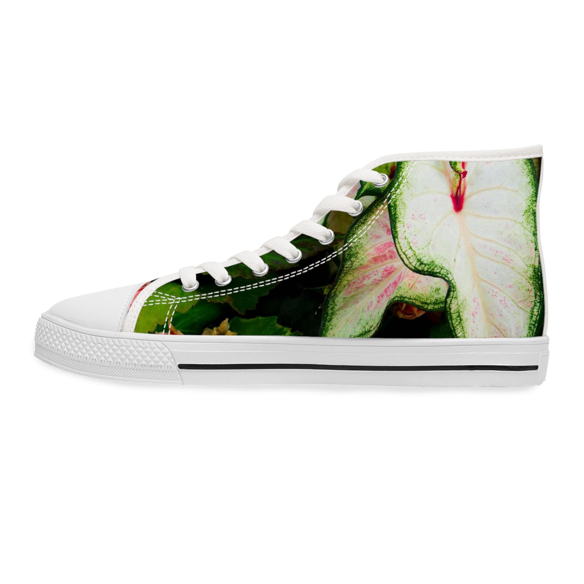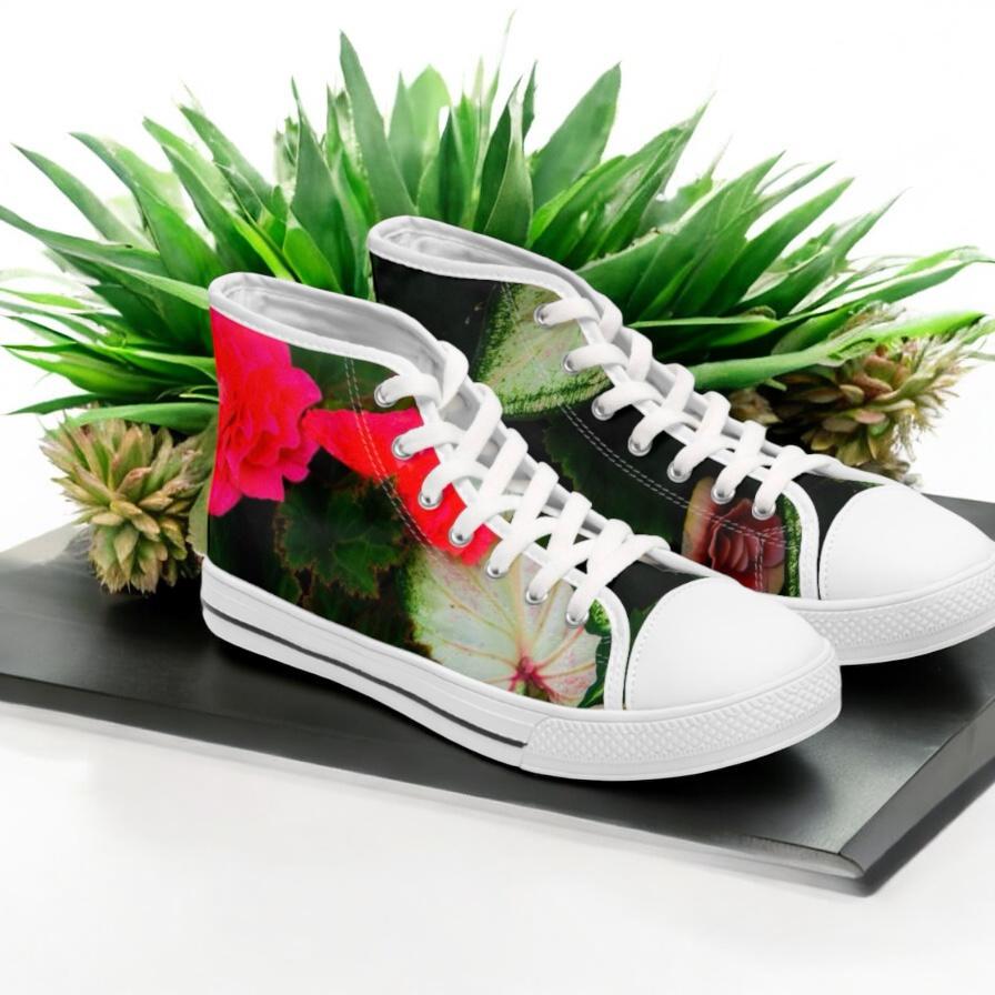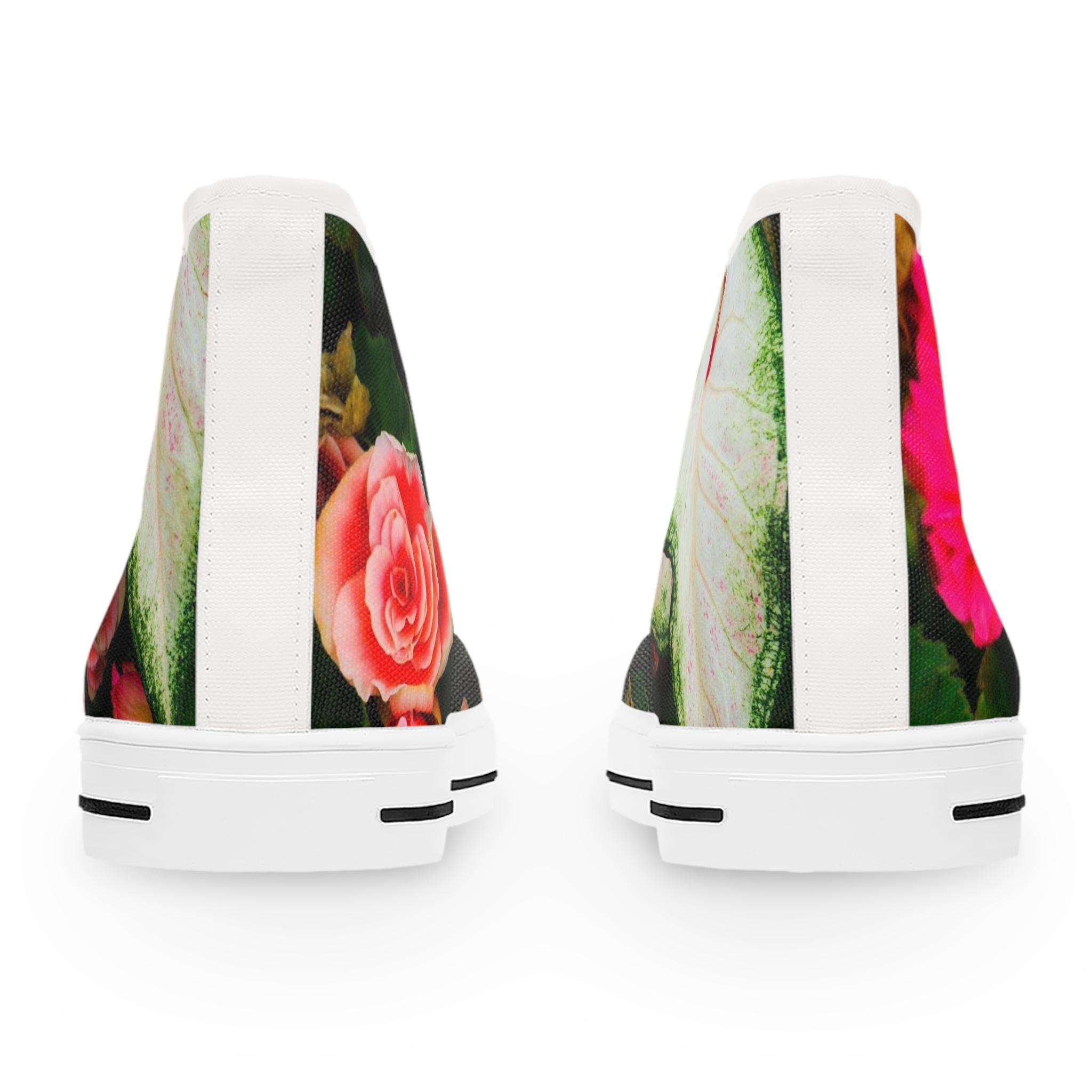 Floral Tapestry Women's High Top Sneakers featuring a beautiful rose design. These sneakers provide a comfortable and stylish option for casual outfits. Perfect for women who love floral patterns and want to add a unique touch to their footwear. Ideal for everyday wear, casual outings, and spring or summer seasons. This beautiful design was created on Martha's Vineyard, MA.