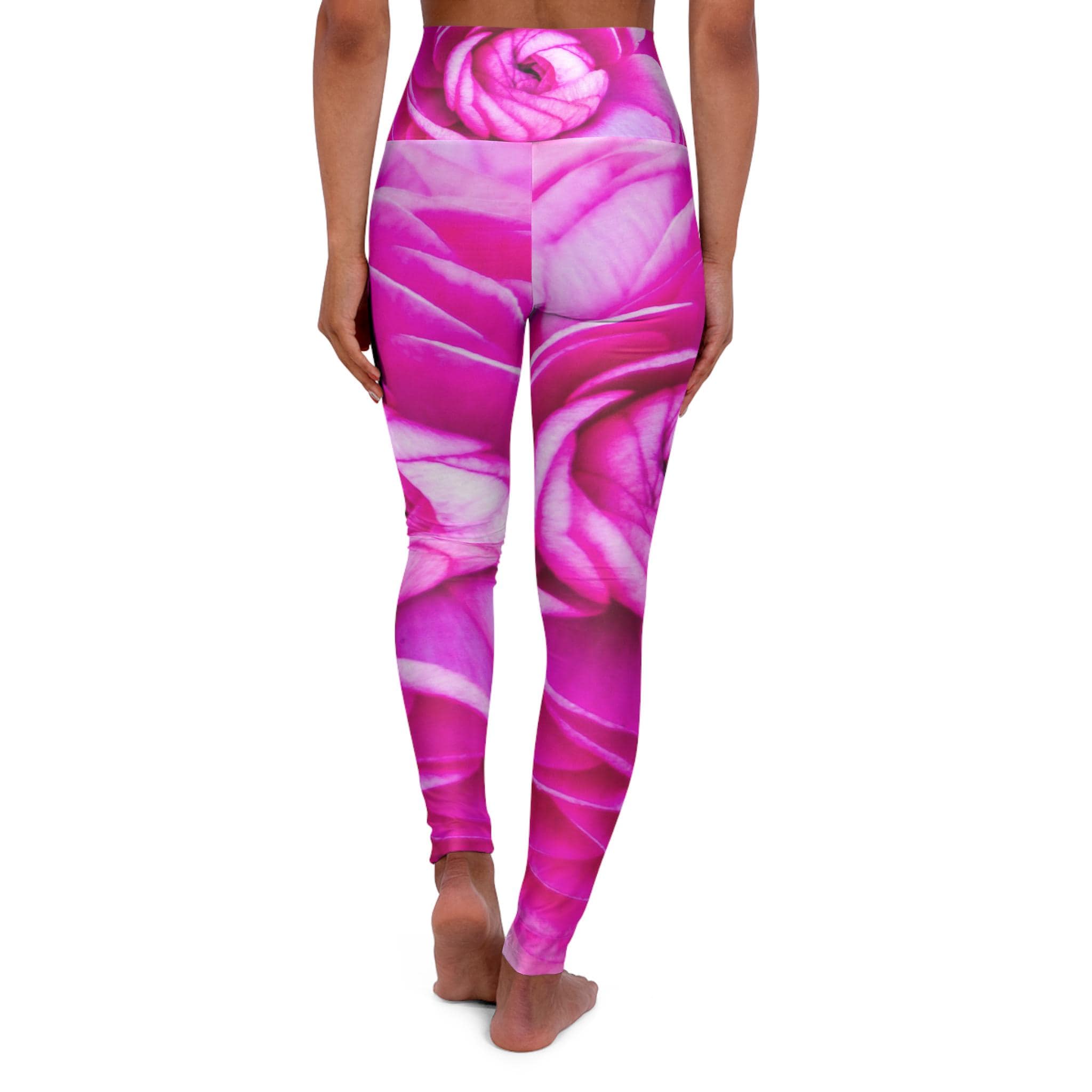 Pink high waisted skinny fit leggings with a floral design, perfect for yoga and exercise. Gives a feminine and stylish vibe, suitable for active and fashion-conscious individuals. Ideal for yoga enthusiasts, fitness lovers, and those who appreciate bold activewear. Relevant for yoga classes, gym workouts, and athleisure wear. This beautiful design Pink Poppy was created on Martha's Vineyard, MA!