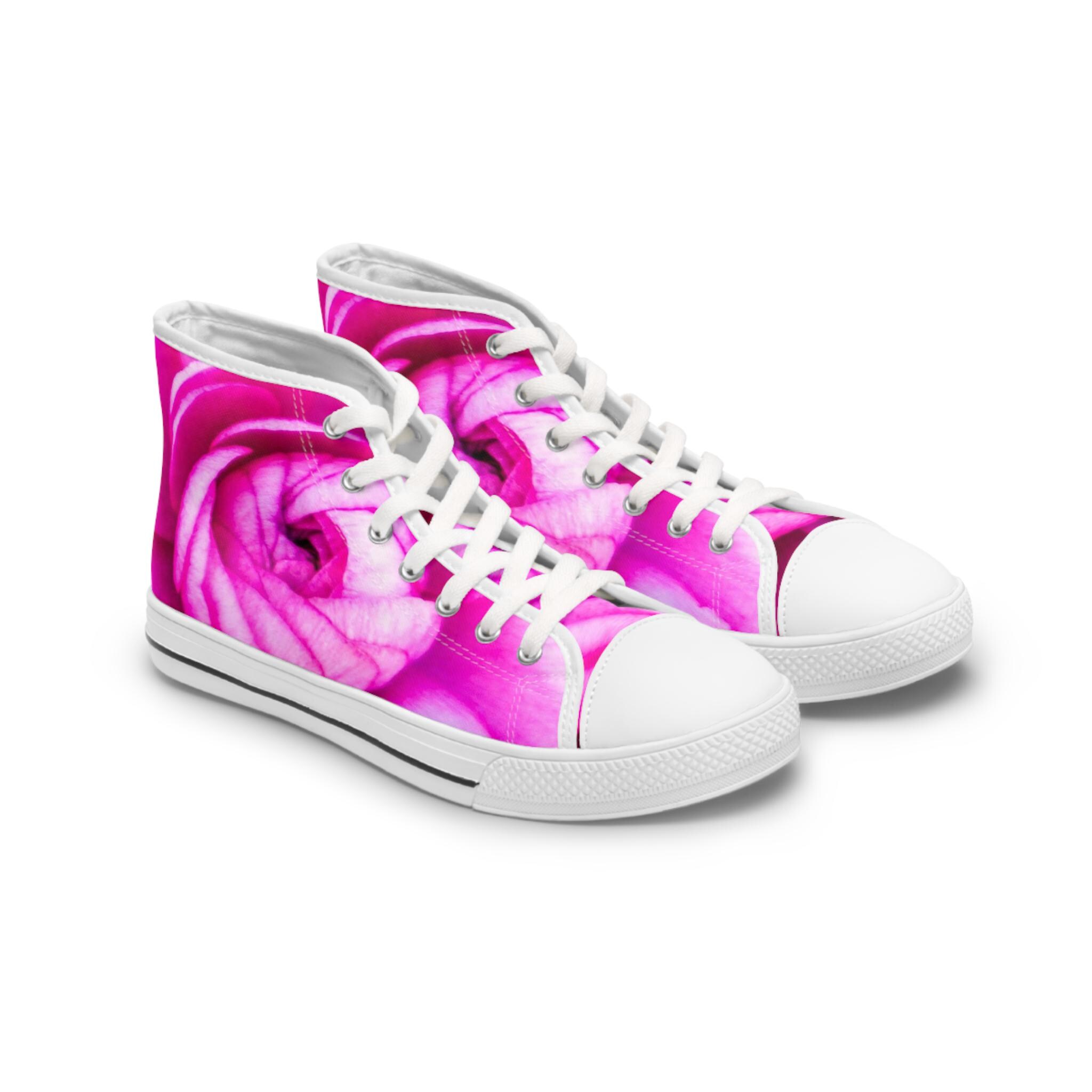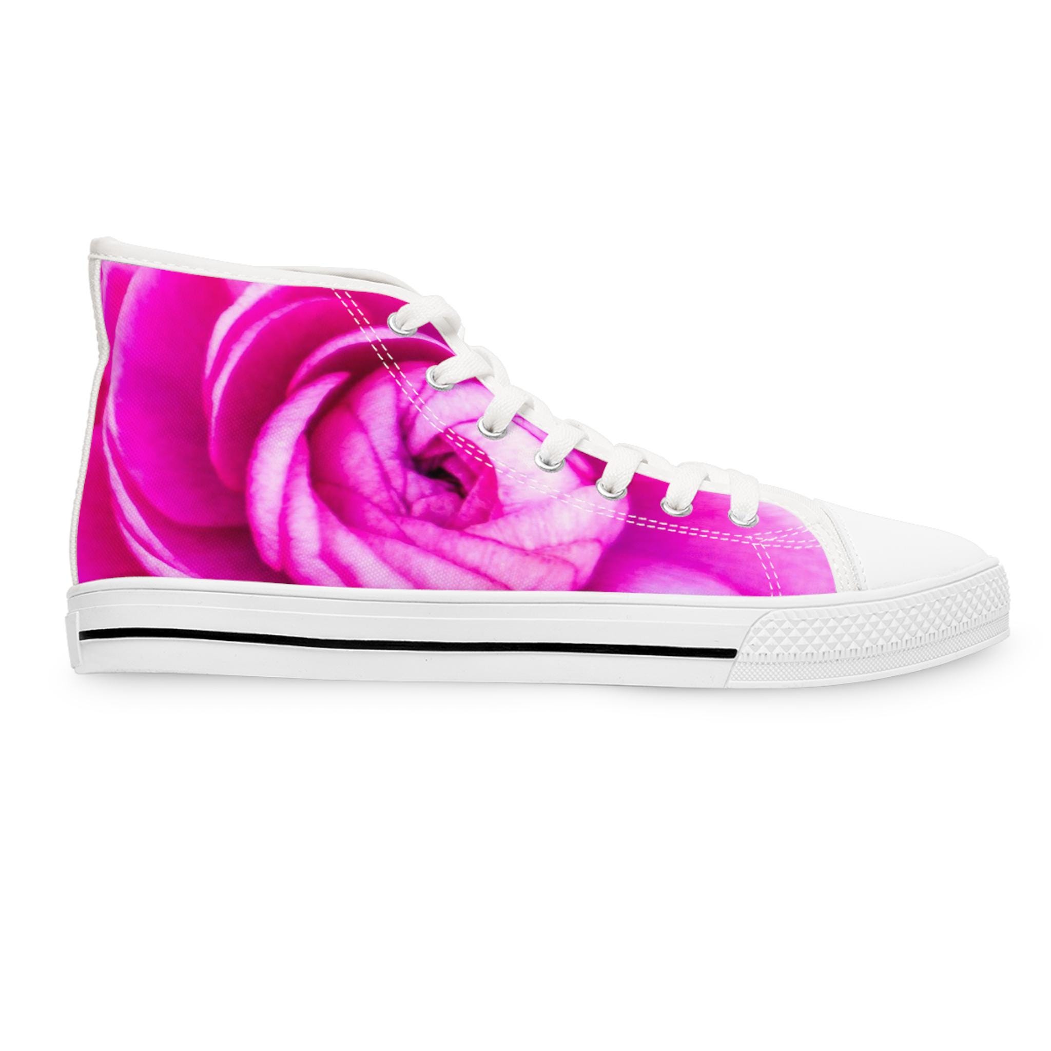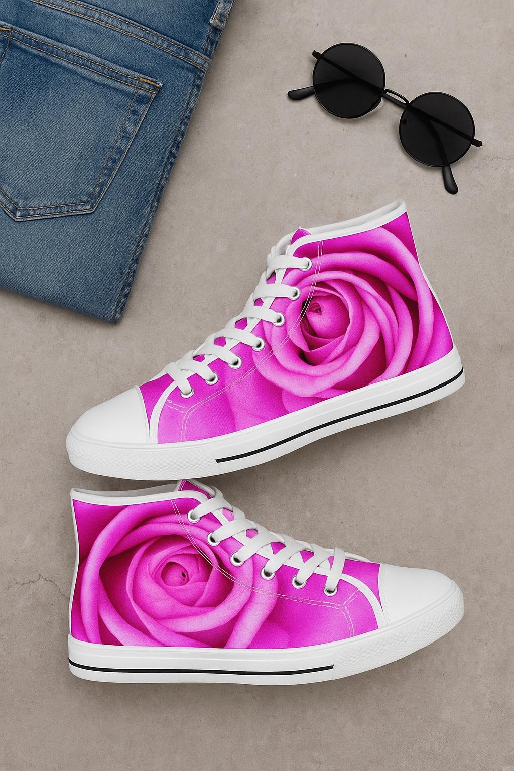 These Pink Rose Women's High Top Sneakers are perfect for the athletic woman who loves adding a touch of femininity to her sporty style. The pink flower design gives off a playful and energetic vibe, making these sneakers ideal for casual outings and everyday wear. Perfect for women who enjoy floral patterns and want to stand out in a crowd. Great for spring and summer fashion, as well as outdoor activities and casual gatherings.