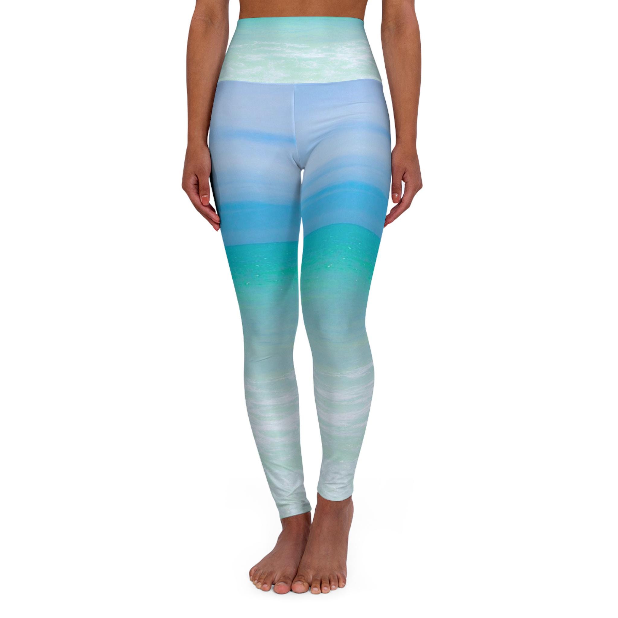 Blue Ocean Inspired Leggings with a high-waisted skinny fit design, perfect for yoga and all athletic activities. These leggings offer vibrant color printing, 4-way stretch for extra freedom of movement, and a smooth 4.5" waistband for a casual look. Made of durable 83% Polyester and 17% Spandex fabric, assembled in the USA. Ideal for women who love yoga and seek stylish and comfortable activewear. Perfect for yoga sessions, workouts, and athleisure wear. This amazing design Cotton Candy Sky was created on Longboat Key, FL