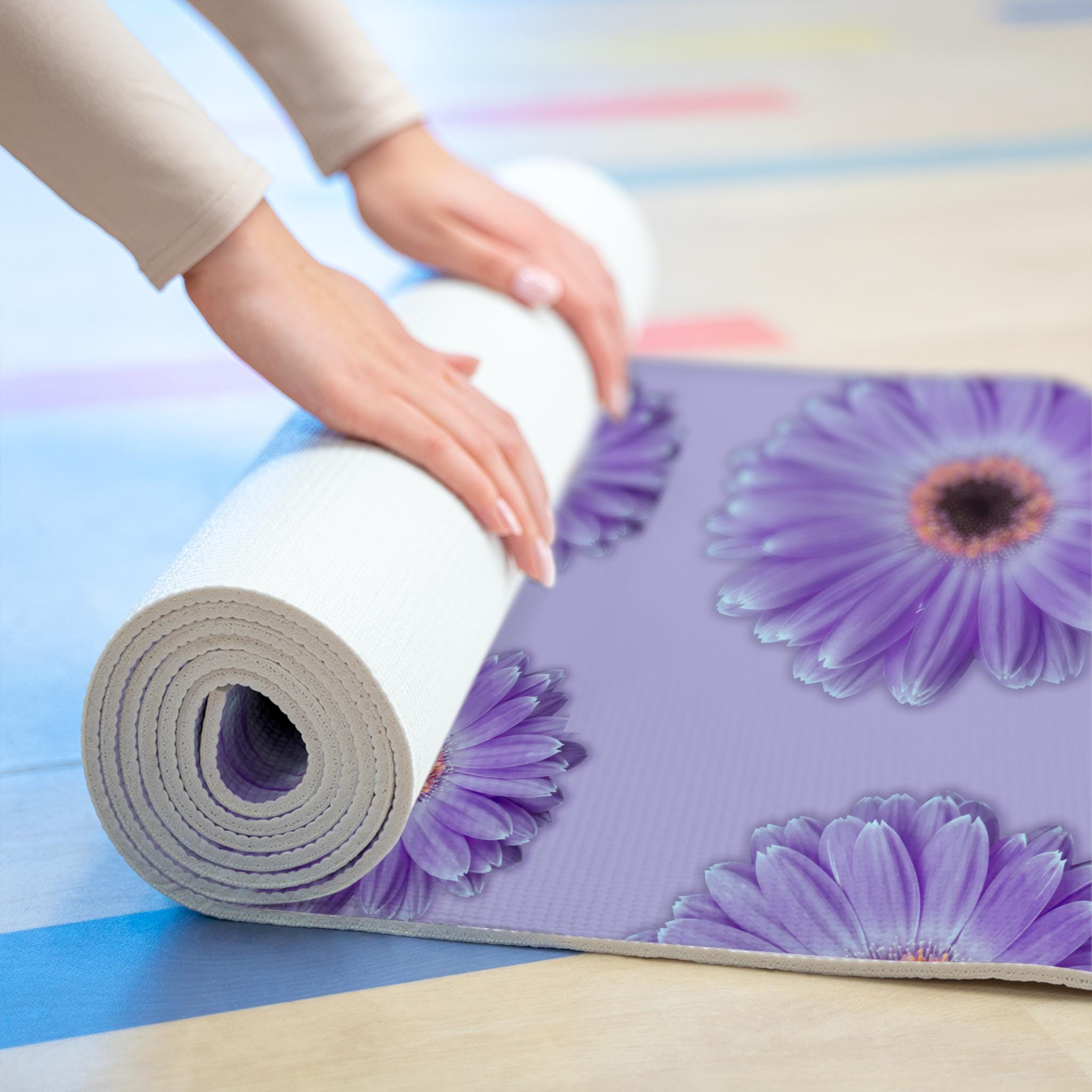 This Lilac Gerber Daisy Yoga Mat is perfect for yoga, meditation, and everyday exercise. The vibrant purple floral design creates a calming and soothing atmosphere, making it ideal for those looking to practice mindfulness and relaxation. This foam yoga mat is relevant for yoga enthusiasts, fitness lovers, and anyone looking to add a touch of beauty to their workout routine. Perfect for Mother's Day, International Yoga Day, or as a thoughtful gift for a friend who enjoys yoga and meditation. This beautiful design was created on Martha's Vineyard, MA.