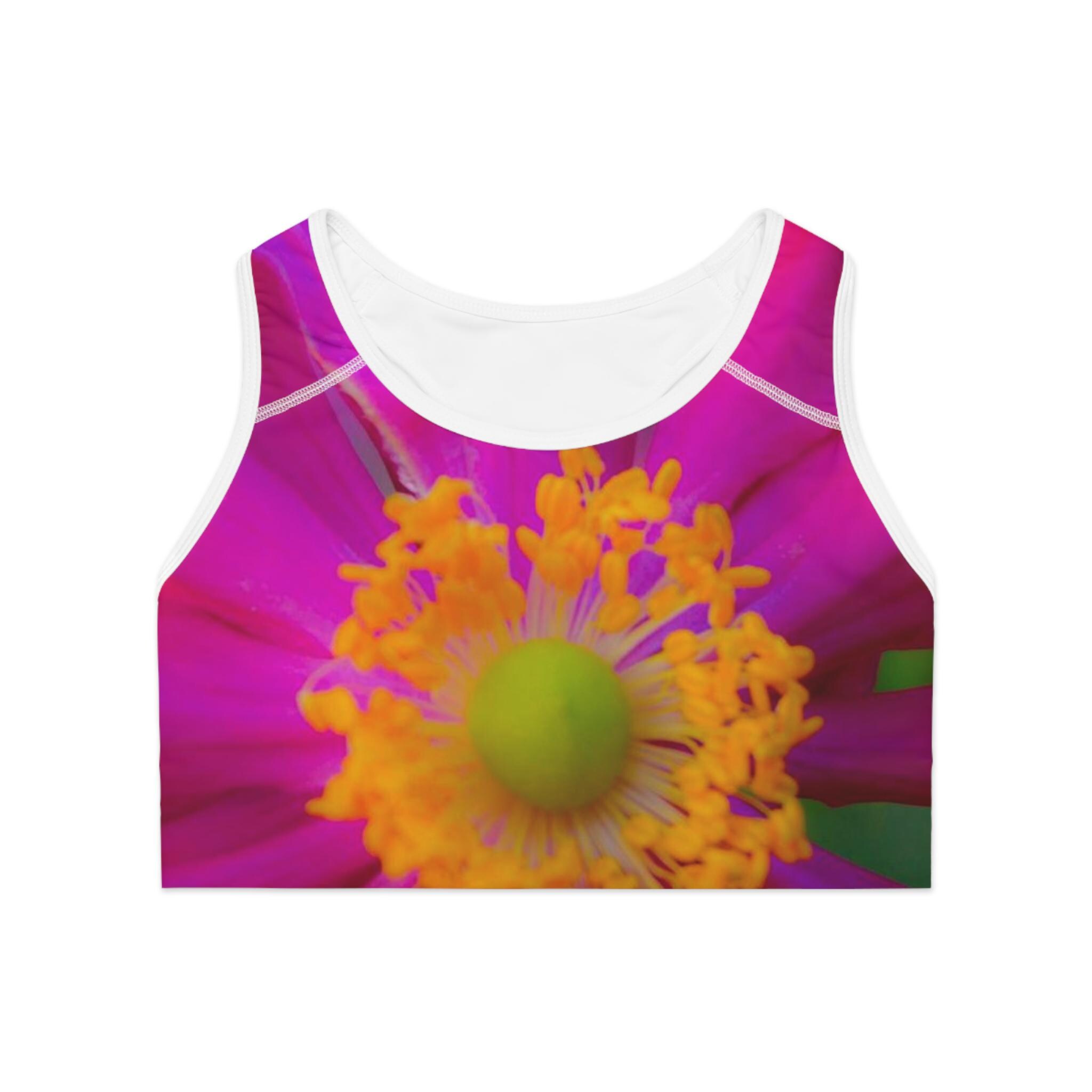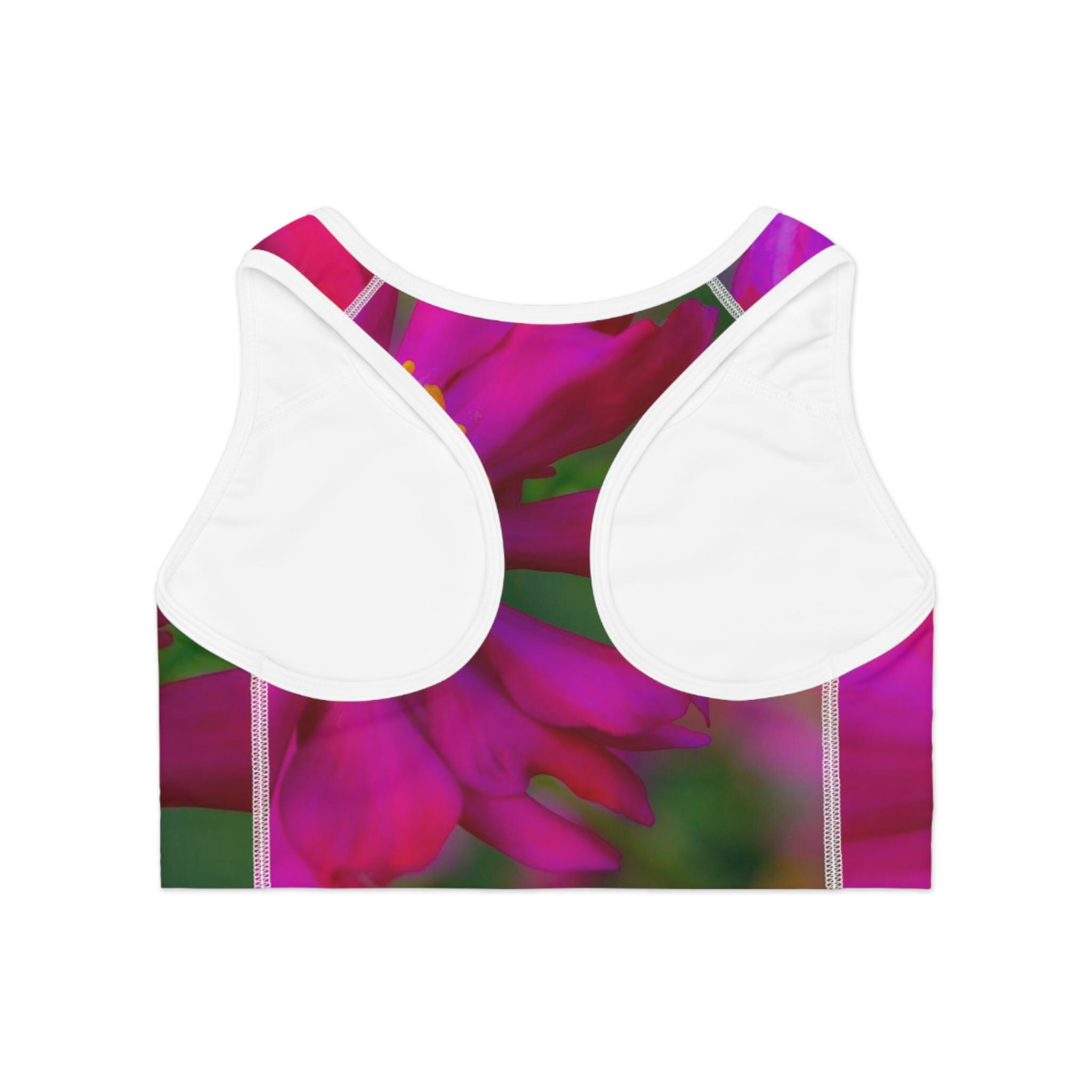 A pink floral sports bra made for women who love yoga and want to match their accessories. This sports bra is light, comfortable, and supportive, perfect for any physical activity. It is designed with moisture-wicking material to keep you cool and dry during workouts. The all-over print adds a stylish touch to your workout wardrobe, making it a great gift for her on any occasion.