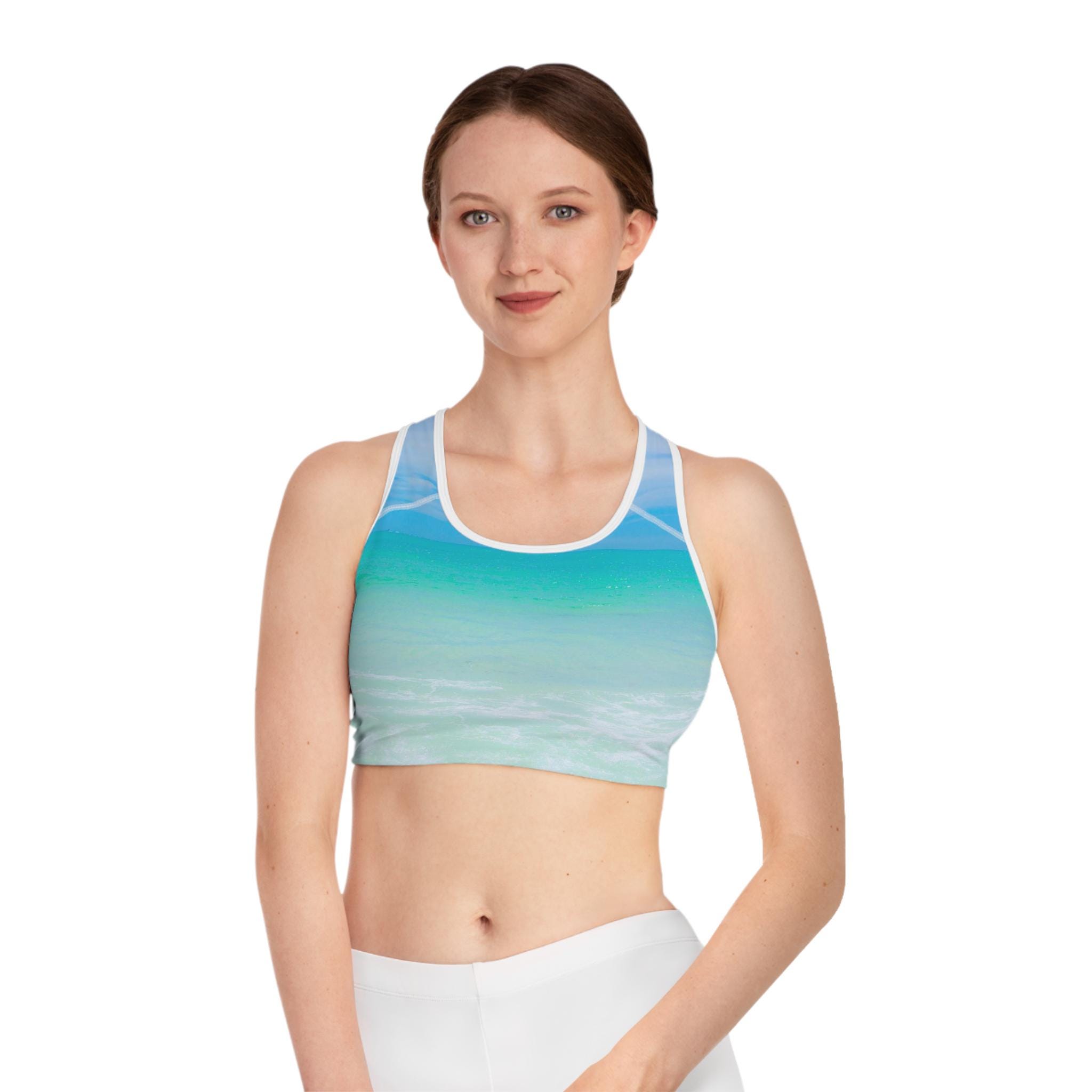 Stay cool and comfortable during your yoga sessions with this Ocean Inspired Women's Sports Bra. The blue ice design adds a calming vibe to your workout routine. Perfect for yoga enthusiasts and fitness lovers, this sports bra is made with moisture-wicking material to keep you dry and comfortable. Ideal for yoga accessories and workout gear, this compression fit sports bra provides support and fit with a double-layer front and wide elastic band. This beautiful design Cotton Candy Sky was created on Longboat Key, FL.