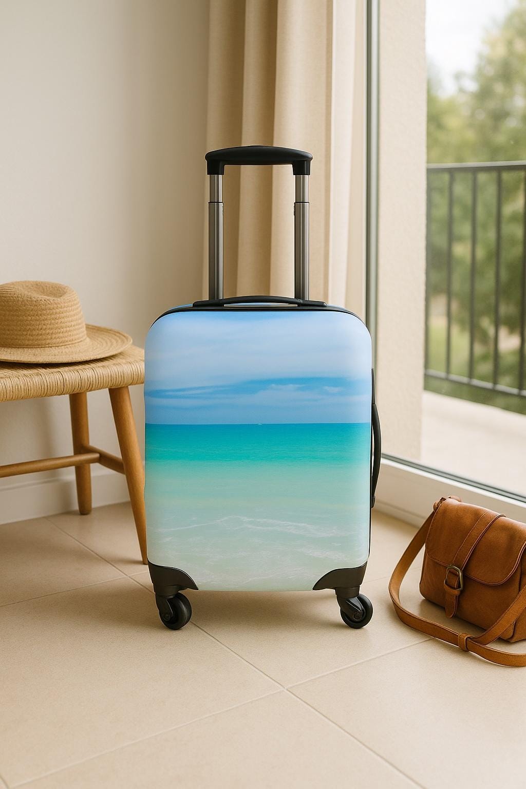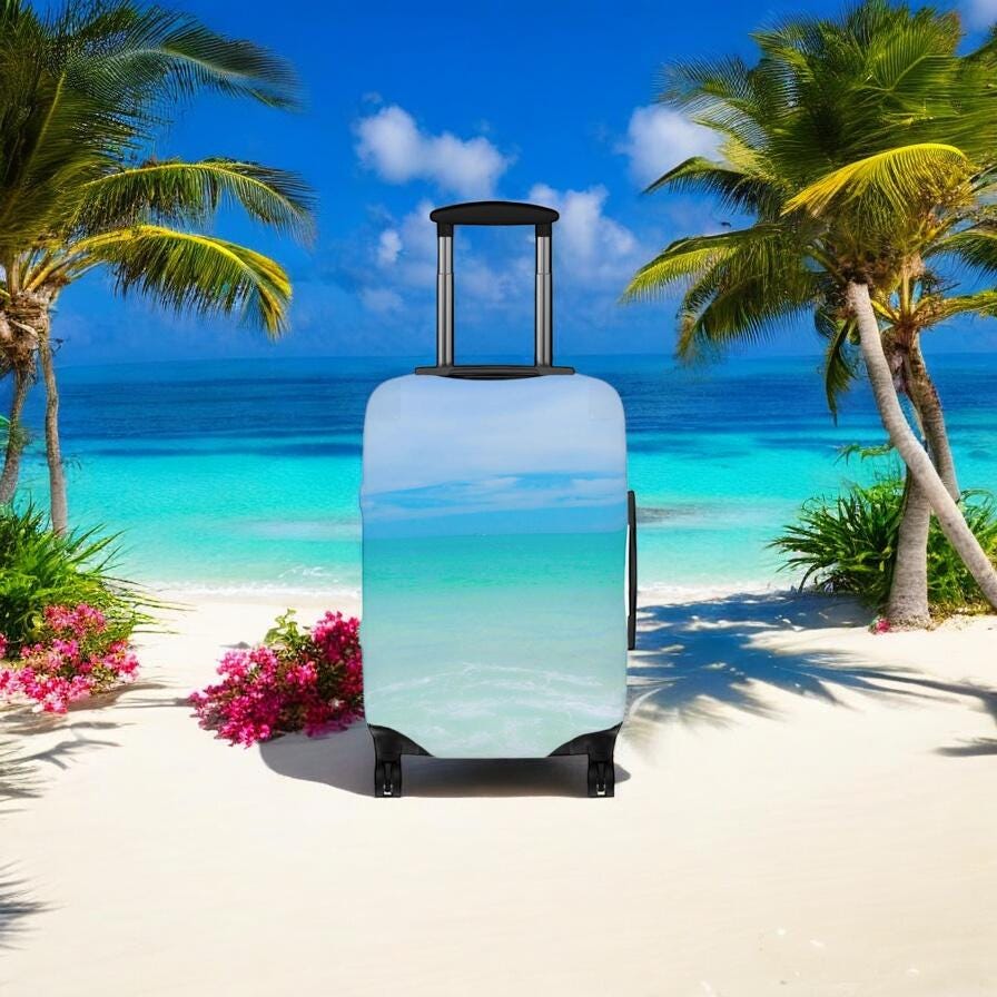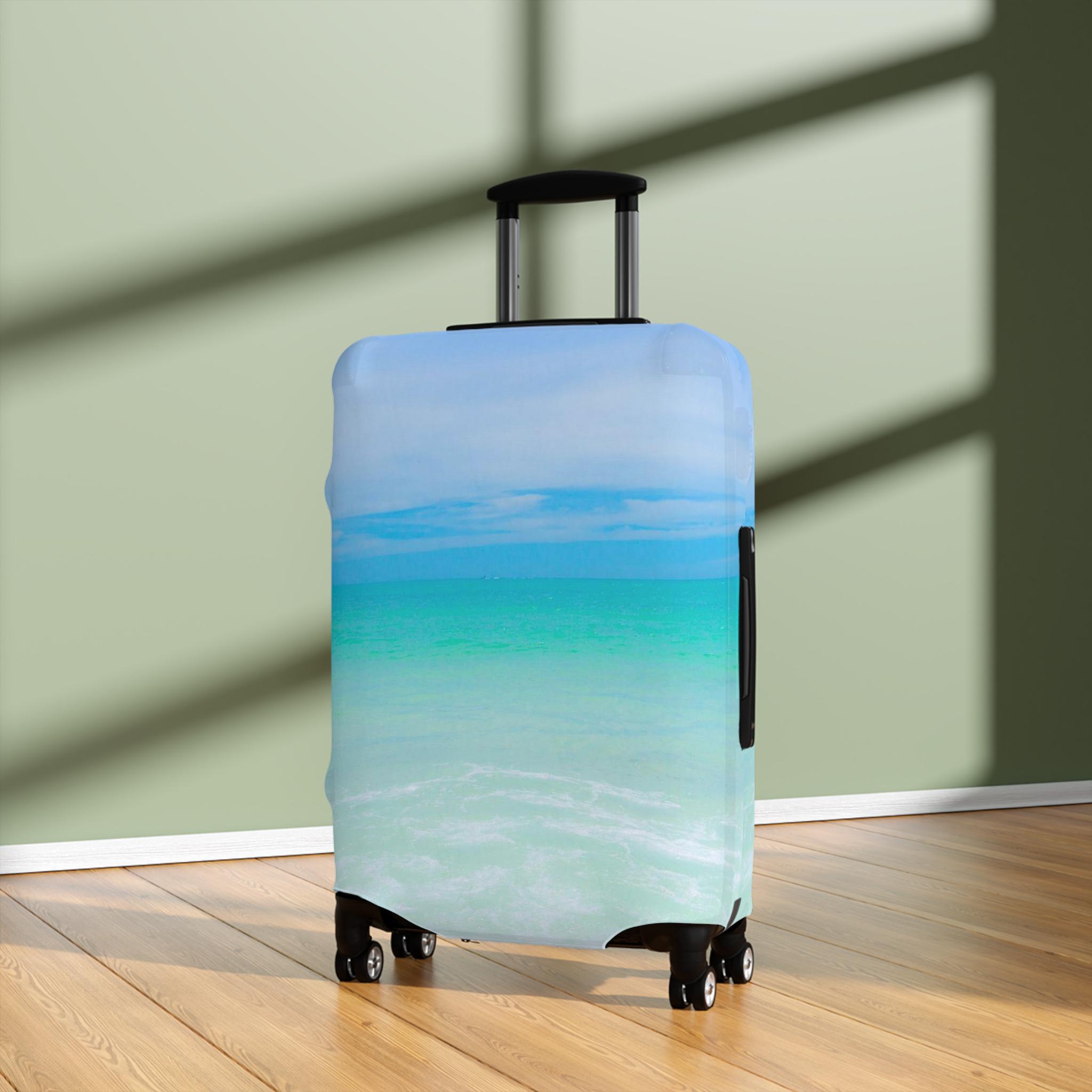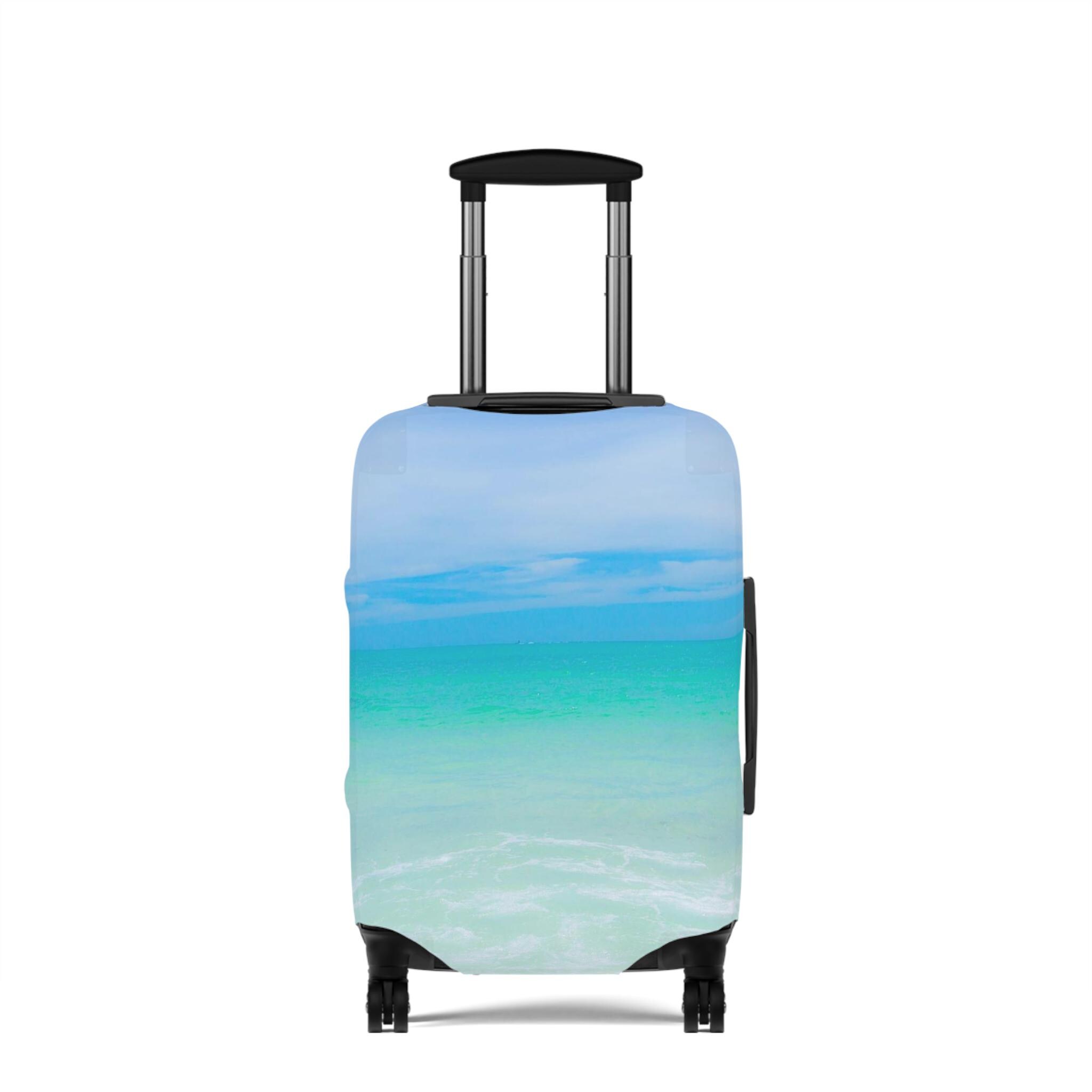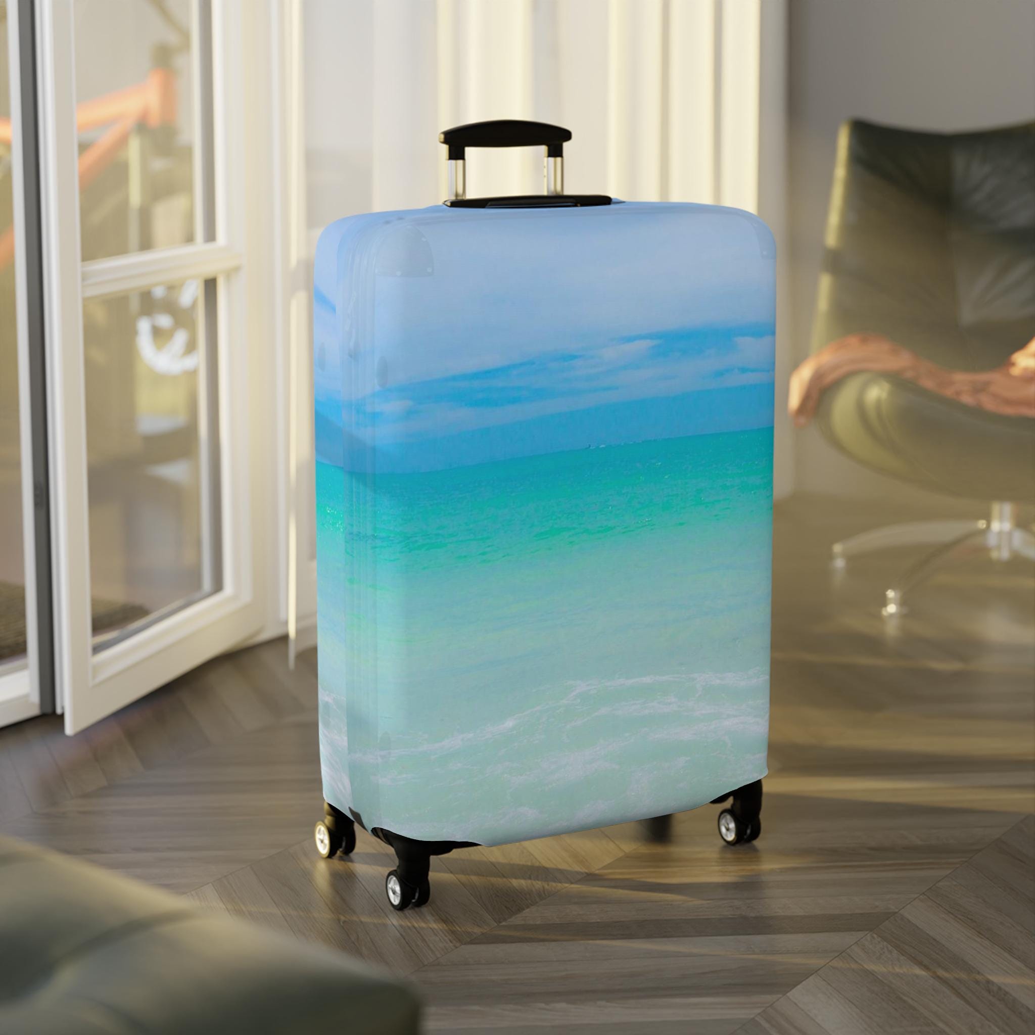 Ocean Blue Luggage Cover with an ocean-inspired design, perfect for protecting your suitcase during travel. Ideal for travelers looking to add a touch of personality to their luggage. Relevant for beach vacations, cruises, and summer travels.